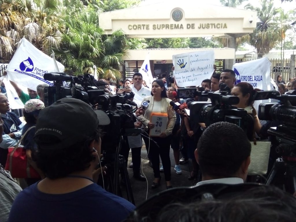 Este día, viernes 4 de octubre de 2019, El Foro del Agua, la Mesa Territorial de la Zona Norte de San Salvador, Junta de Agua ARA Joya Galana, Vicaría Padre Rutilio Grande, Tutela de Derechos Humanos del Arzobispado de San Salvador, Universidad Centroamericana José Simeón Cañas, la Mesa de Iglesias y Movimiento Laical, que juntos conformamos el Colectivo Salvemos Valle el Ángel; en el marco del día Interamericano del Agua, presentamos demanda de Inconstitucionalidad contra el Convenio ANDA-DUEÑAS, con el que se concesiona 17,280,000 litros de agua por día, para el uso exclusivo de la familia Dueñas en el abastecimiento de agua potable para el Proyecto Urbanístico Ciudad Valle el Ángel, afectando con ello la dotación de más de al menos 345,000 personas y el AMSS.